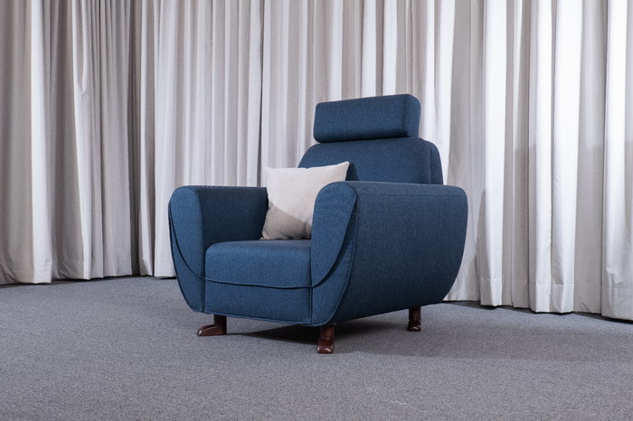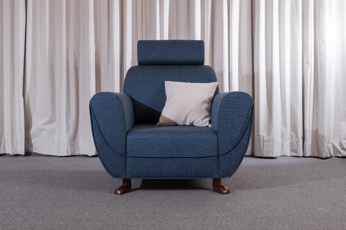 騎士的形象。高背型的沙發,是Cube-Net椅子工廠目前椅背最高的款式。頭枕的高度、厚度可以訂製。例如可以增加頭枕的厚度,在看電視的時候倚靠,視線可以水平向前。椅腳有L形腳與圓柱腳兩種可以選擇。